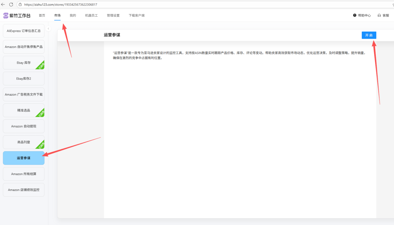 在紫竹工作台(www.zizhu123.com)市场中找到运营参谋,点击开启。